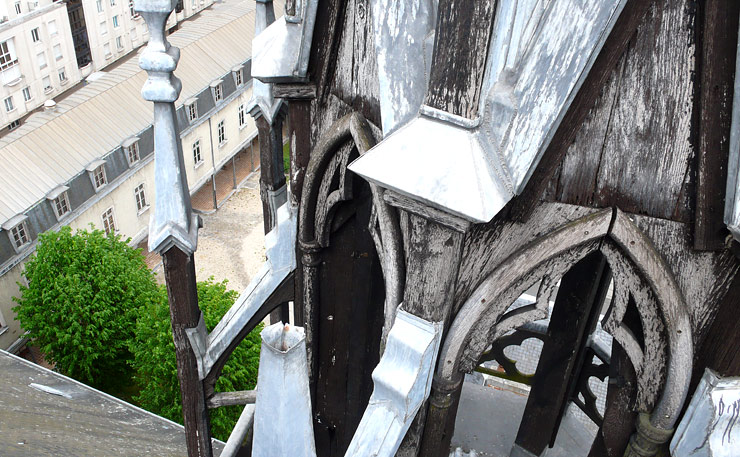 Charpente de la flèche: état en cours de travaux.